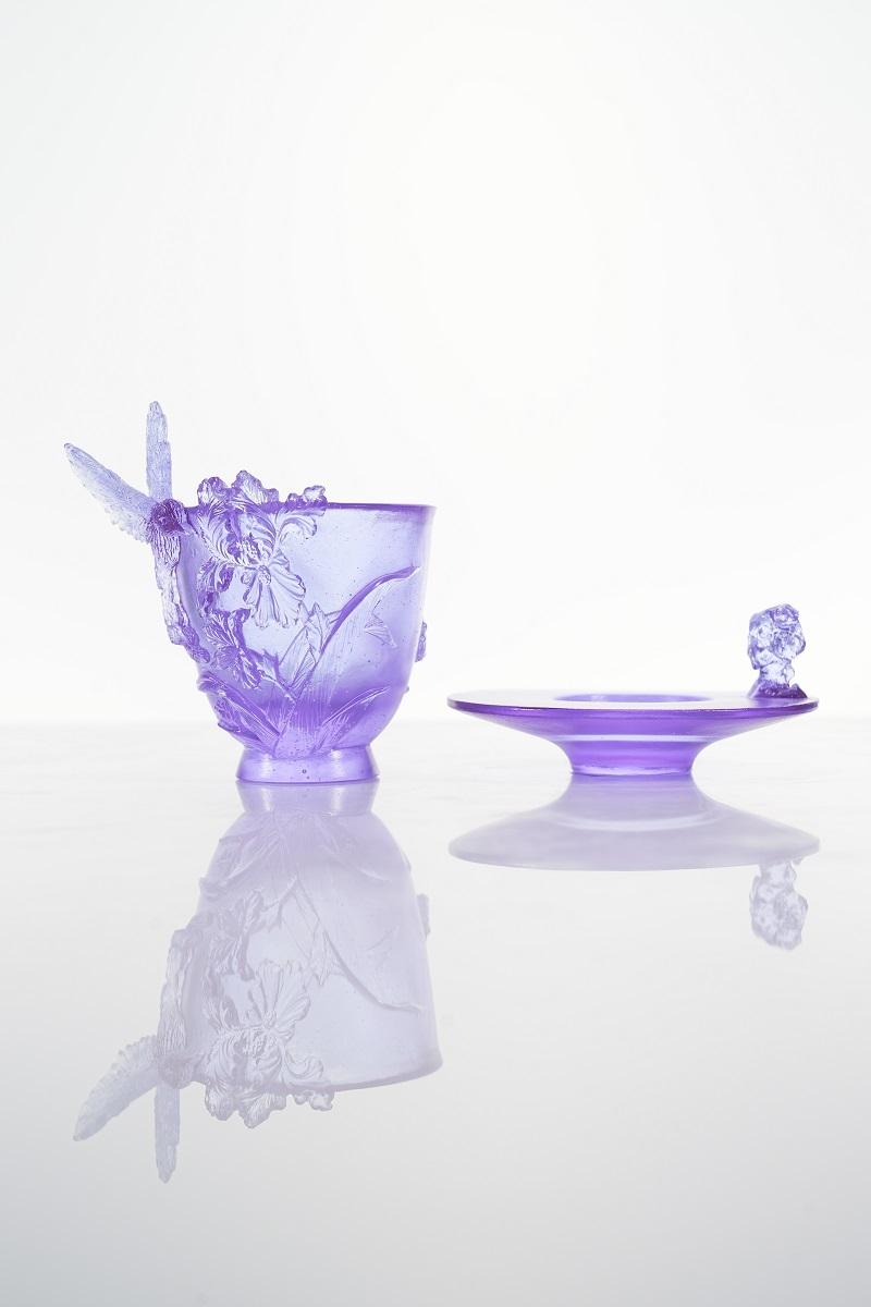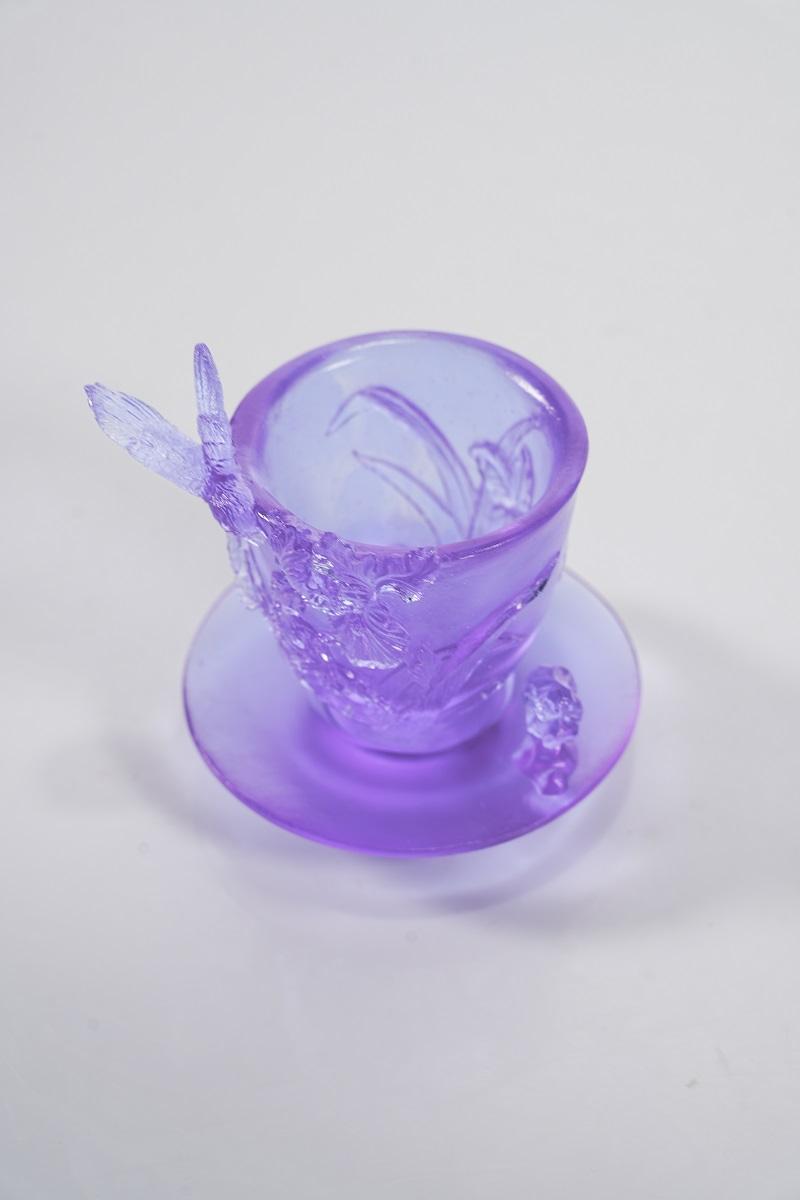 杯身以鸢尾花为设计核心,线条流畅圆润,杯口微微外展,握持舒适,既保留了传统茶器的实用属性,又融入鸢尾花的柔美意象。鸢尾花的纹路雕刻细腻,花瓣舒展自然,没有繁复堆砌,仅以简约线条勾勒形态,与琉璃的通透相得益彰,藏着东方美学的含蓄与内敛。