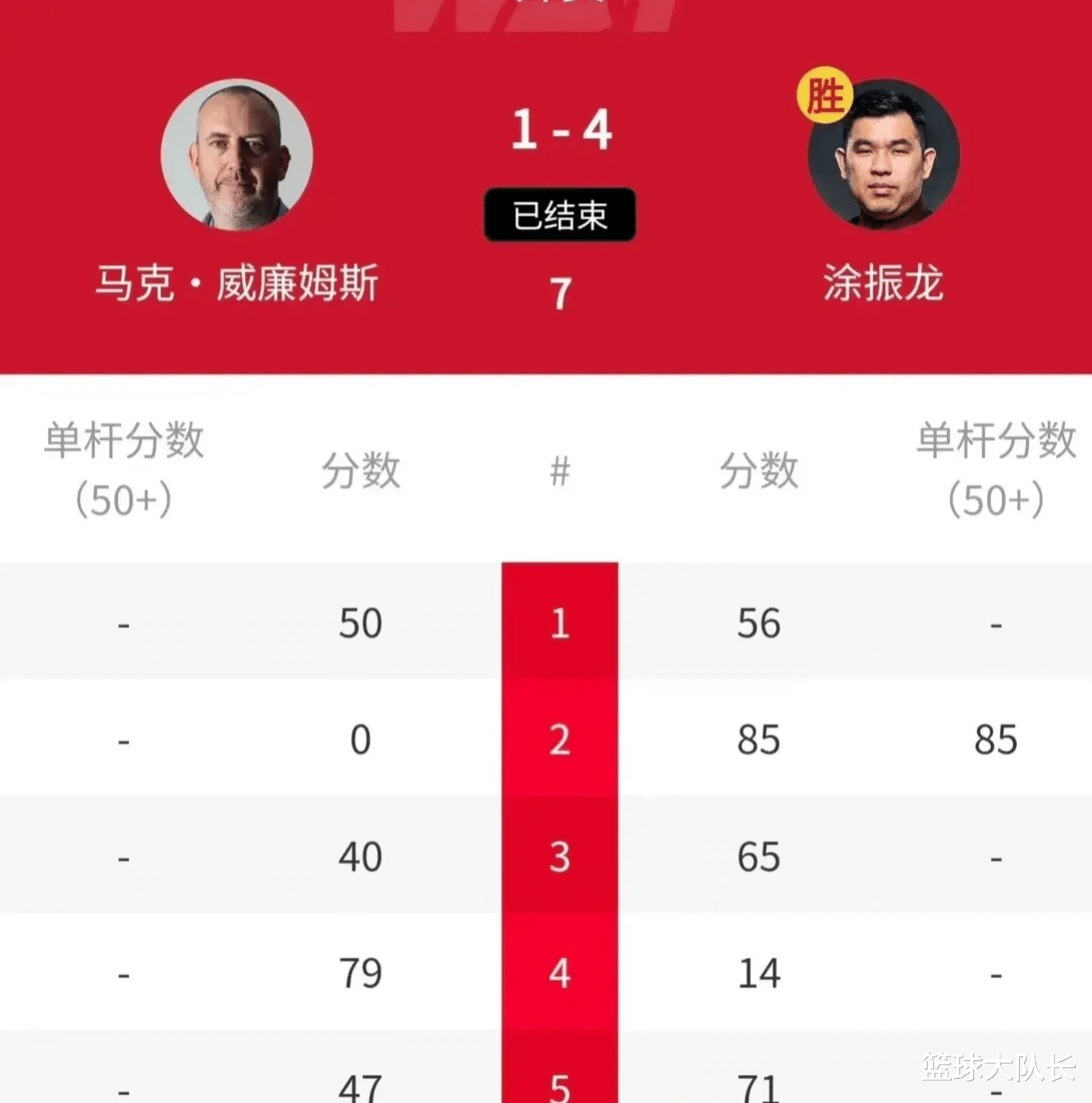 马克·威廉姆斯 1-4 涂振龙和丁俊晖不敌希尔不同,马克·威廉姆斯 1-4不敌马来西亚选手涂振龙则是爆出了英国公开赛的更大冷门,涂振龙目前世界排名80开外,而马克威廉姆斯则是世界前10人物,但比赛过程却是一边倒的局面,比赛仅用了5局,而马克·威廉姆斯更是在前3局比赛中一局未胜,第四局马克·威廉姆斯79比14扳回1局,但第5局涂振龙再度71比47拿下,大比分4比1淘汰马克·威廉姆斯,马克·威廉姆斯和丁俊晖一样止步128强。
