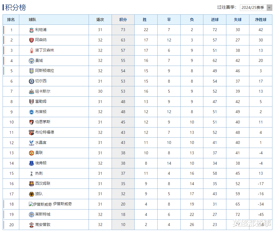 其他比赛中,布莱顿主场2-2战平莱斯特城,佩德罗点射双响,客队终结连败;埃弗顿客场1-0绝杀诺丁汉森林,杜库雷几乎读秒破门;阿斯顿维拉客场3-0完胜南安普顿,升至积分榜第5位,沃特金斯、马伦和麦金分别破门。