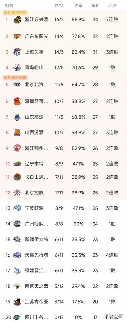 北京时间1月21日,今晚的CBA常规赛第18轮结束了两场比赛,我们看看最新积分榜变动!广厦102-79大胜北控23分豪取