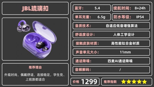 推荐理由:外观时尚,佩戴舒适,连接稳定,学生党、上班族都适合