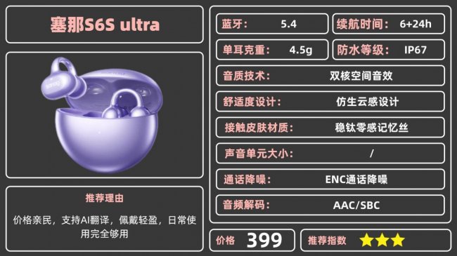 塞 那S6 S ult ra的价格和南卡ClipSuper2一样,性价比方面做得还不错。单耳重量只有4g,比南卡还轻一点,佩戴起来很轻盈,加上0.6mm的记忆柔丝和人体工学结构,能适配各种耳型,压力分布得很均匀,戴久了也不会觉得夹耳朵。