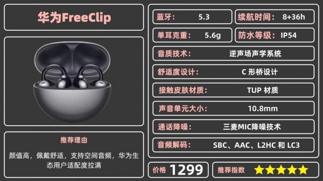 推荐理由:颜值高,佩戴舒适,支持空间音频,华为生态用户适配度拉满