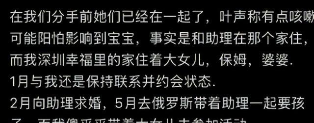 博主声称,叶海洋在当年一月之时还在和她约会交往,但在二月就向自己的助理玛尼求婚,并在同年五月就和玛尼一起前往俄罗斯“求子”。