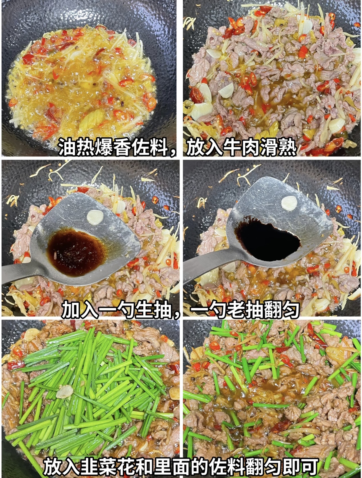 香味出来之后,就可以把腌制好的牛肉倒入锅中了。用大火快速翻炒,把牛肉划散,让每一片牛肉都均匀受热。这个过程一定要快,大概翻炒30秒到1分钟,看到牛肉变色,八成熟的时候就可以了。如果炒的时间太长,牛肉就会变老,影响口感。