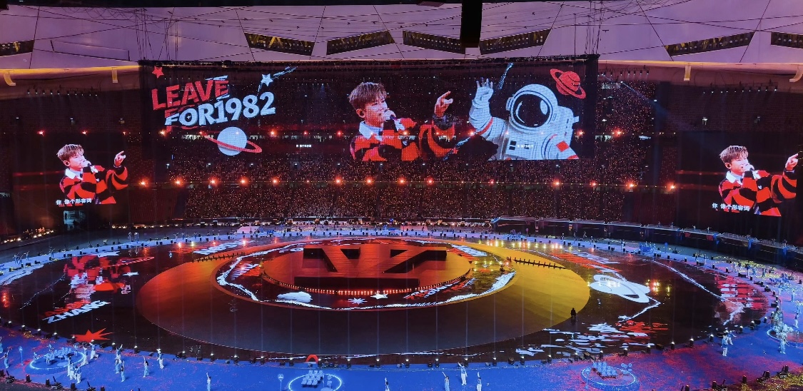 舞台设计的突破是这场演唱会的核心亮点。张杰团队彻底打破传统演唱会“台上演、台下看”的模式,将鸟巢内场10000多平方米的区域全部改造为环形主舞台,70米直径的中心转台搭配34米可旋转装置,实现360度无盲区观演。更震撼的是长达100米的机械列车装置,12个“时间中转站”车厢沿轨道巡游,歌手可近距离与各区域观众互动,花车巡演时观众甚至能伸手触及飘落的彩带与花瓣。配合11000平方米的环形LED巨幕与2400平方米吊装透明悬浮屏,裸眼3D特效构建出“星际隧道”“机甲破碎”等场景,让观众仿佛置身时空穿越之旅。