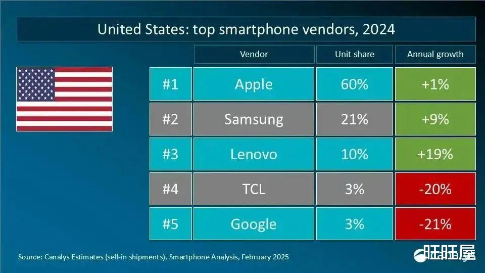 Canalys高级分析师朱嘉弢告诉旺旺屋,对于美国市场来说,去年整体的体量是1.3亿左右,其中苹果占了60%,三星占21%,联想占10%,所以中国公司受到的影响比较小,苹果受到的影响比较大。