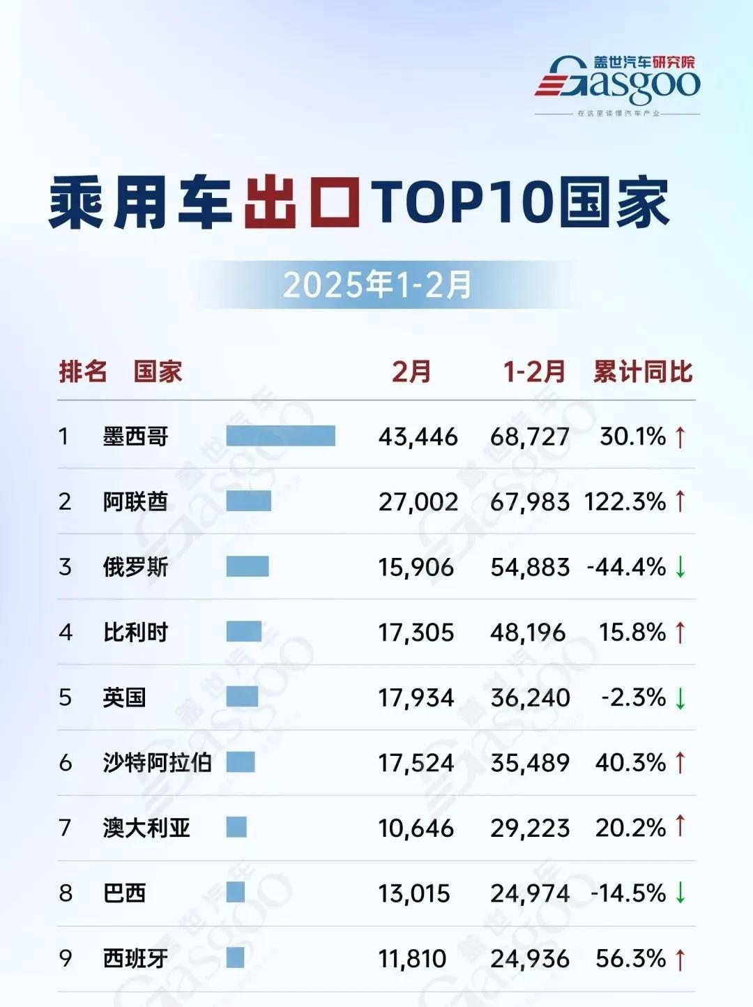 在当今全球汽车市场瞬息万变的大背景下,中国乘用车的出口表现无疑成为了一个热议的话题。你是否曾关注到,中国汽车正在如何一路狂奔,打破传统市场的局限,让人们为之瞩目?根据盖世汽车研究院的最新数据显示,2025年初的中国乘用车出口情况立即引发了各方关注,特别是在不同地区市场表现上的巨大差异,尤为引人注目。有人说,墨西哥的领跑只是开始,而阿联酋的暴涨让人看到新兴市场的潜力;同时,俄罗斯的冷遇让人不禁掩面思考,未来的市场会如何变幻?