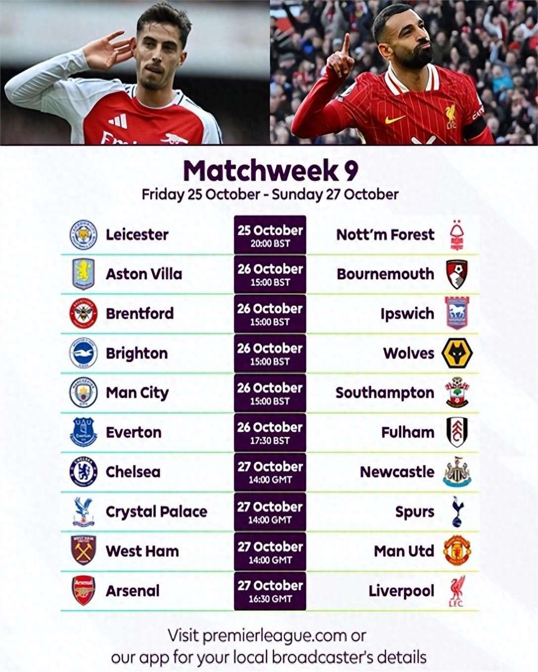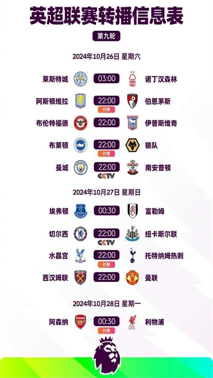 总之,24/25赛季英超联赛第9轮的比赛即将全面展开,球迷们即将迎来一场场精彩纷呈的对决。在这个充满激情和悬念的周末,让我们一起期待这场足球盛宴吧!