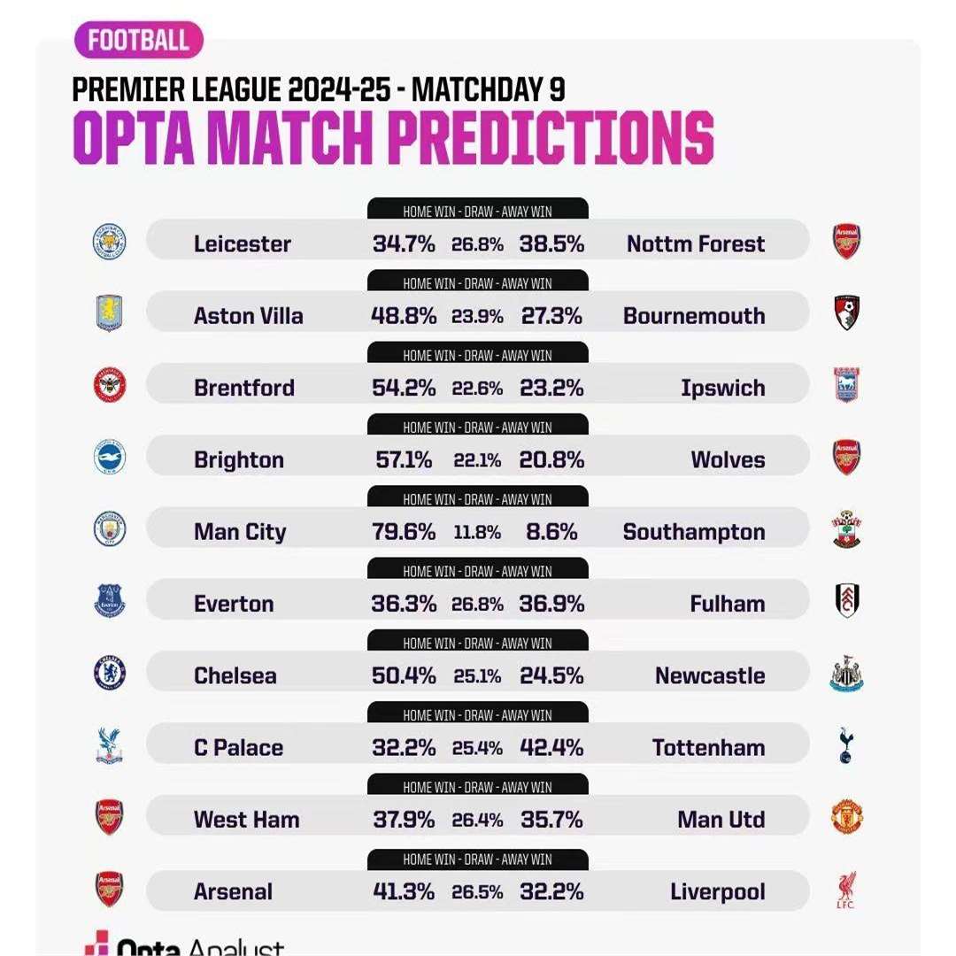 本轮英超的焦点战役主要集中在周日晚至下周一凌晨,这些比赛无疑将成为球迷们关注的焦点。在比赛开始之前,英国媒体和数据机构纷纷给出了预测,希望能够为本轮联赛提供一些参考。然而,预测结果并非总是准确的,比如OPTA的胜平负预测中就出现了至少三处错误的队标。