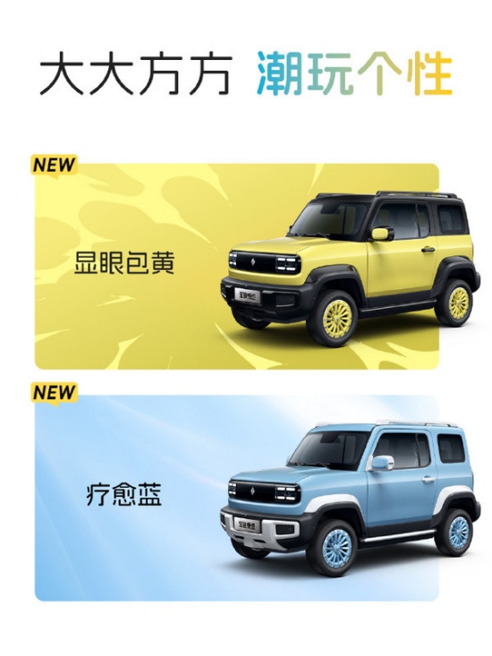 作为特别版车型,新车延续了现款车型方正的造型设计,最大变化在于配色,显眼包黄搭配暗夜黑外观套件,疗愈蓝搭配极光白外观套件,全系标配车身同色飞机涡轮造型轮毂,赋予了整车更多潮玩属性。新车长宽高分别为3381mm*1685mm*1721mm,轴距2110mm,最小离地间隙150mm,最小转弯半径为4.6m。