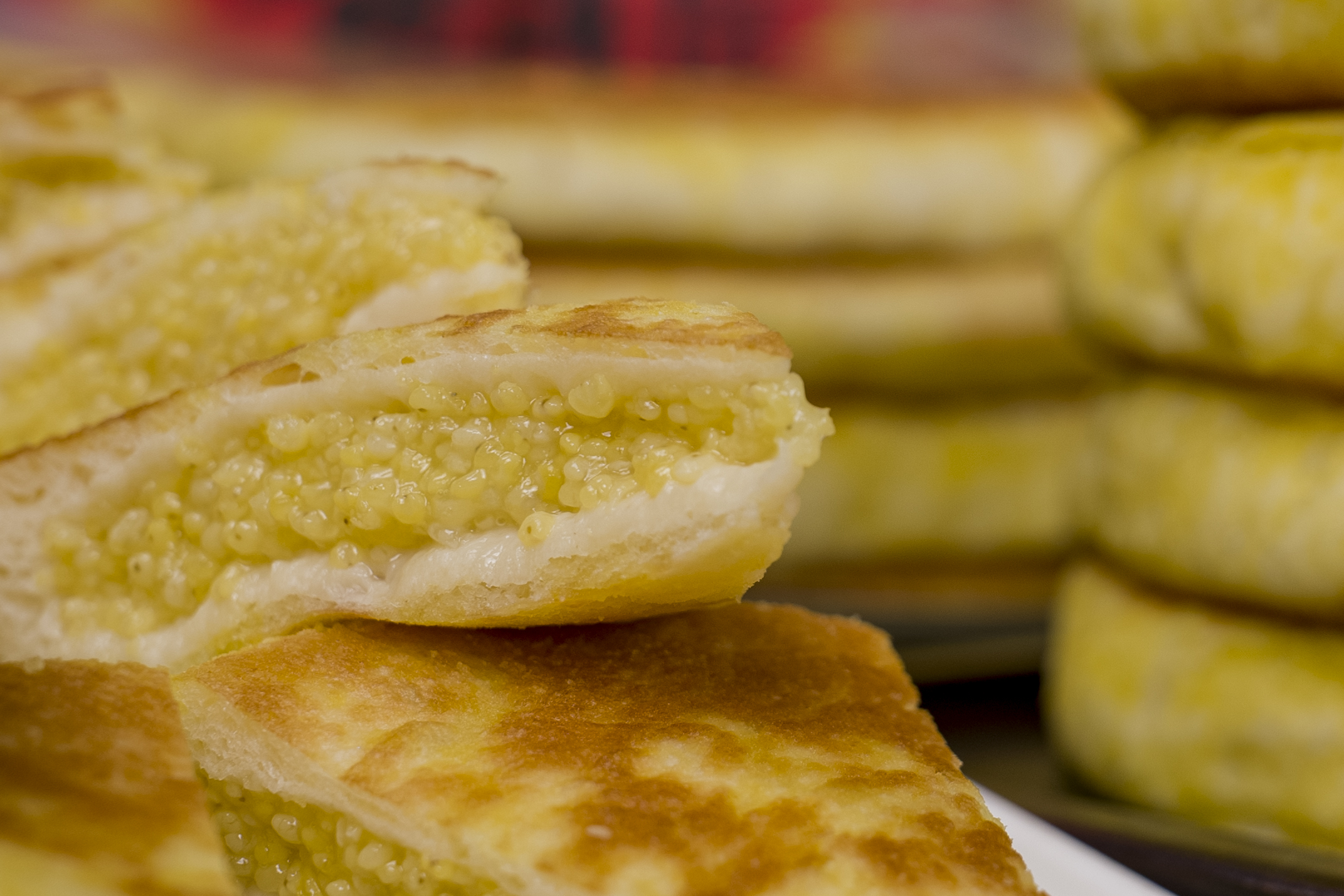 谁能拒绝一锅蒸得热乎乎的大黄米饼?掀开锅盖的瞬间,浓郁的米香扑面而来,金黄软糯的饼身冒着热气,拿在手里沉甸甸的,掰开后内里绵密粘牙,带着黑土地大黄米的自然甜香,不齁腻不发硬,这才是东北黄米饼的正宗味儿!