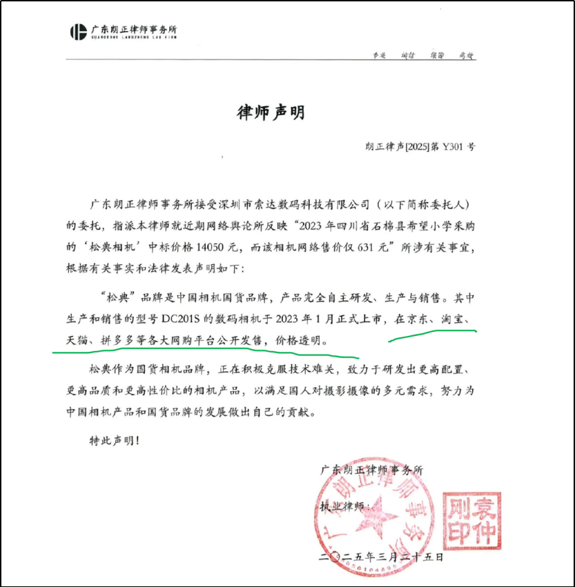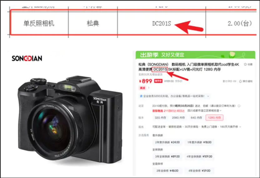 中标相机“松典”,单价14050元,市场价631元。官方旗舰店自己都急了,赶紧出来撇清:“我们一直卖600多,没涨过。”