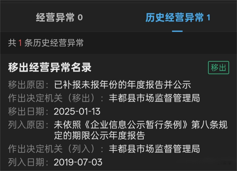 而且这家公司自2019年起就被列入经营异常名录,一待就是五年,直到2024年1月才成功“摘帽”。