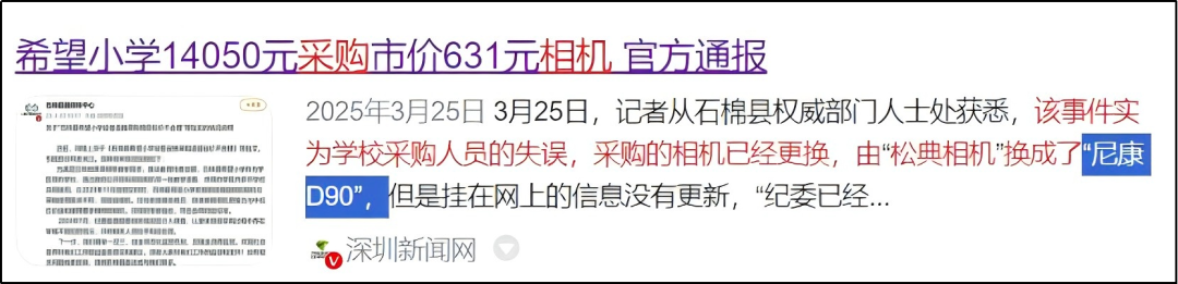学校后来改口,说买的是“尼康D90”。问题是,这款相机发布于2008年,全新套机不超3000元,二手市场甚至不到千元。