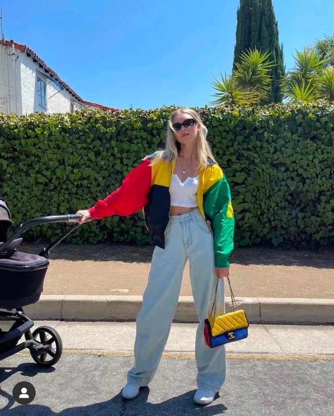 运动外套也是不错的选择,有了撞色外套的加入,整套look都变得摩登亮眼了。内搭穿简单的吊带配高腰牛仔裤,瞬间拉高腰线,气场绝了!