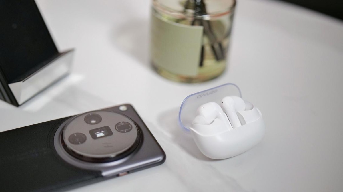我手上的这款的Mars Pro是一个云雾仓的设计,耳机舱盖是一个透明的白色的设计,可以看到里面的耳机,耳机仓是一个白色的座舱设计,正面有一个CIYINSO的瓷音未来的LOGO设计。