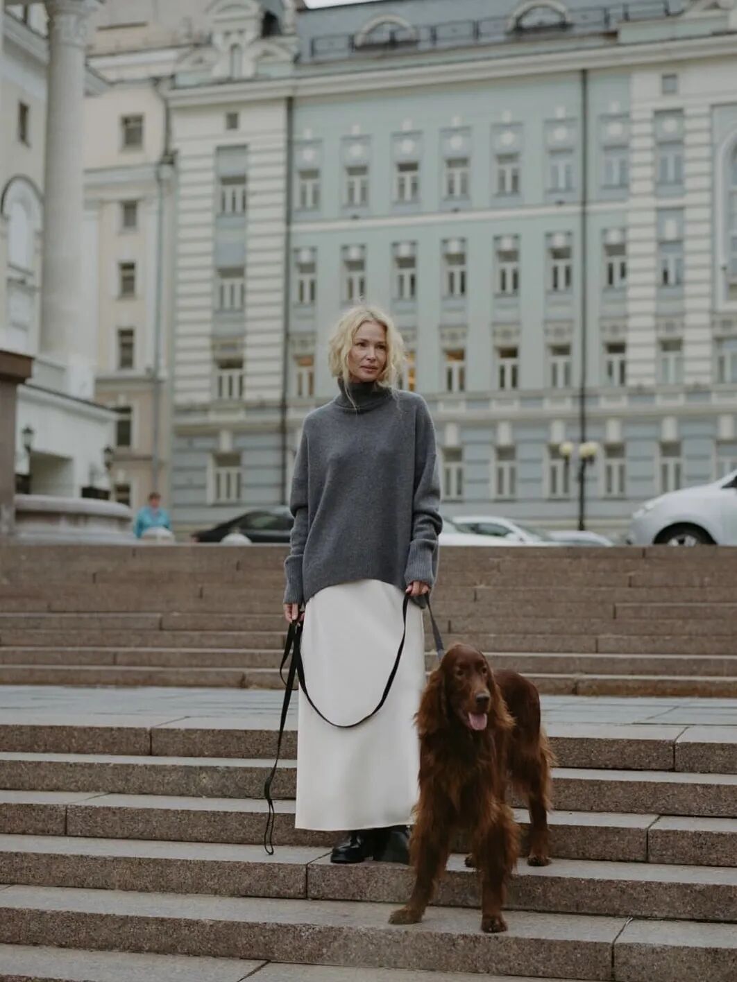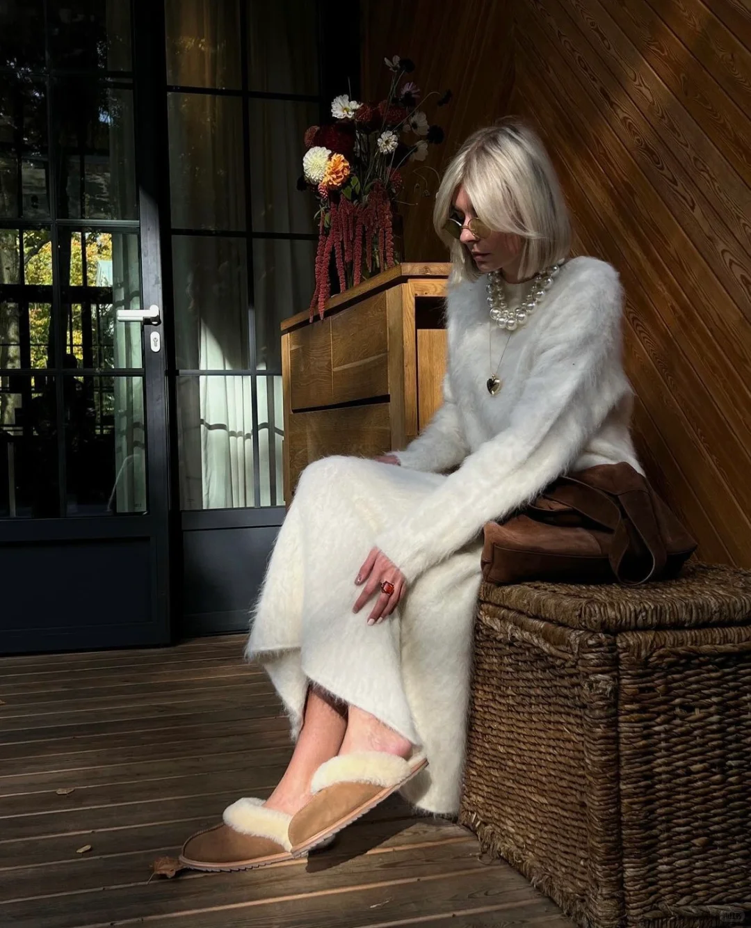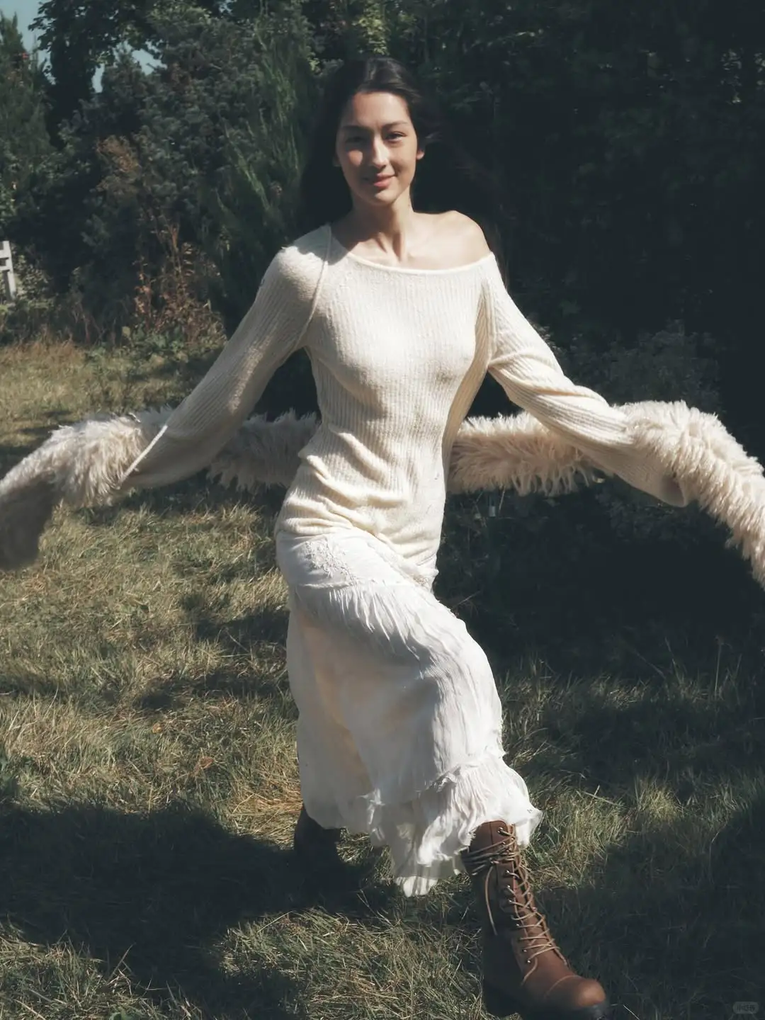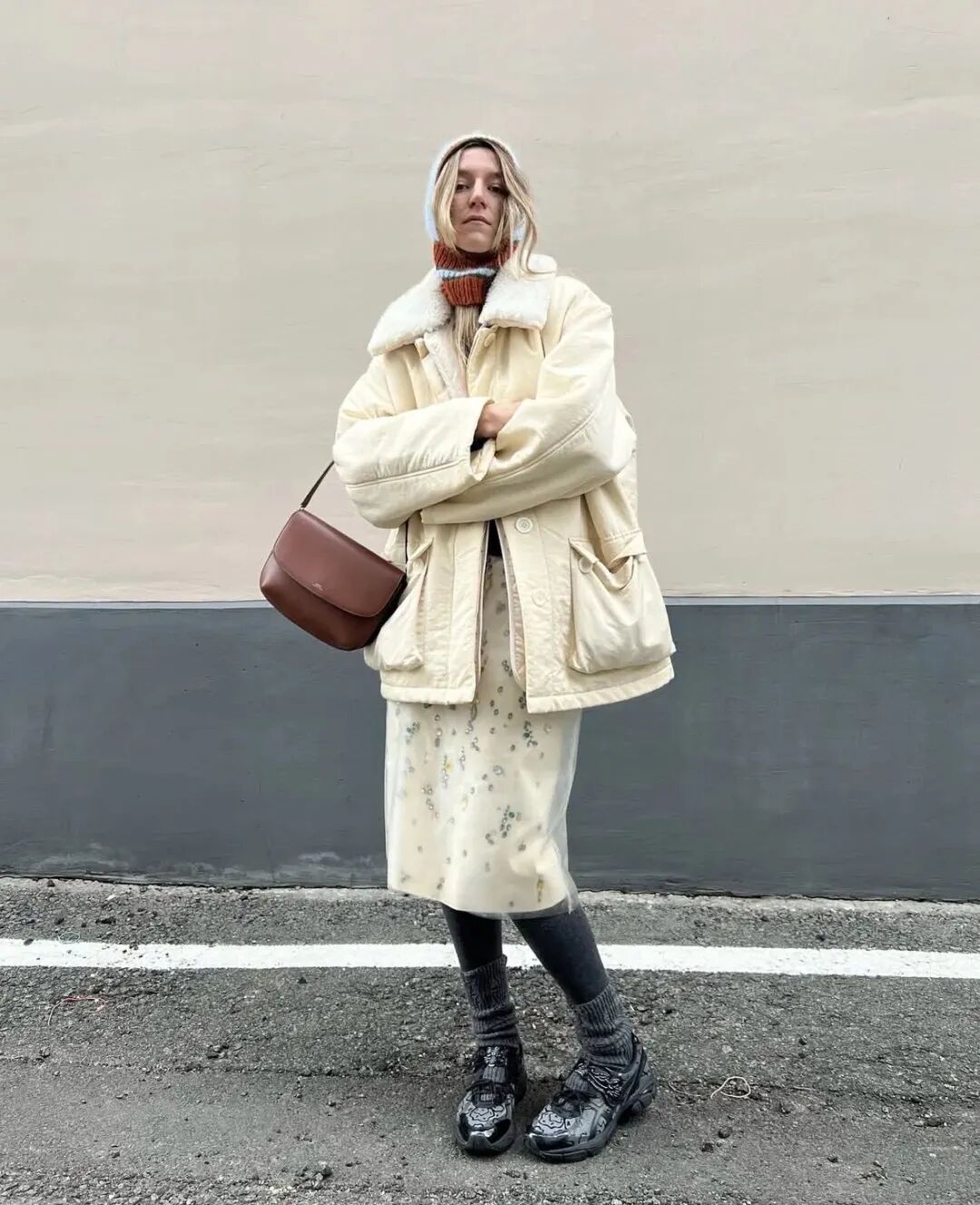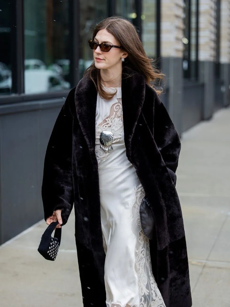 毛绒外套搭配真丝初恋裙,诠释暖意不必密不透风,美感无需用力过度。