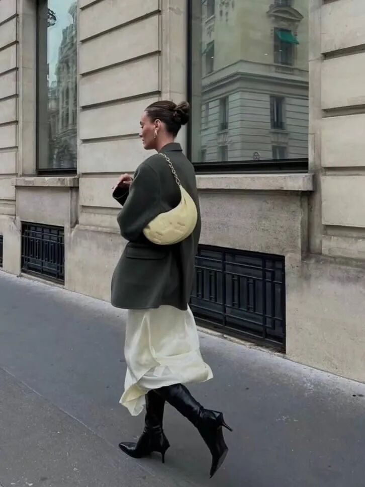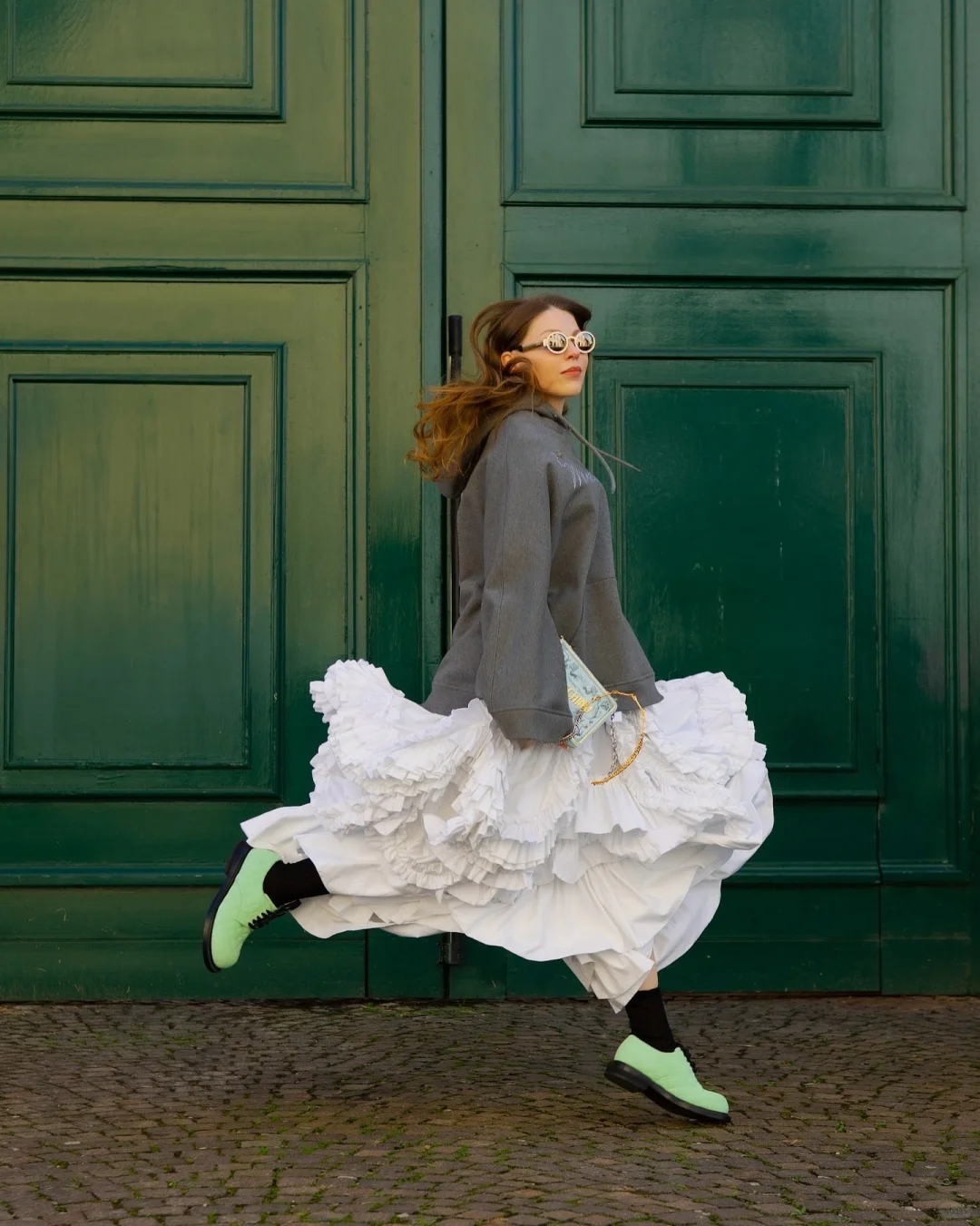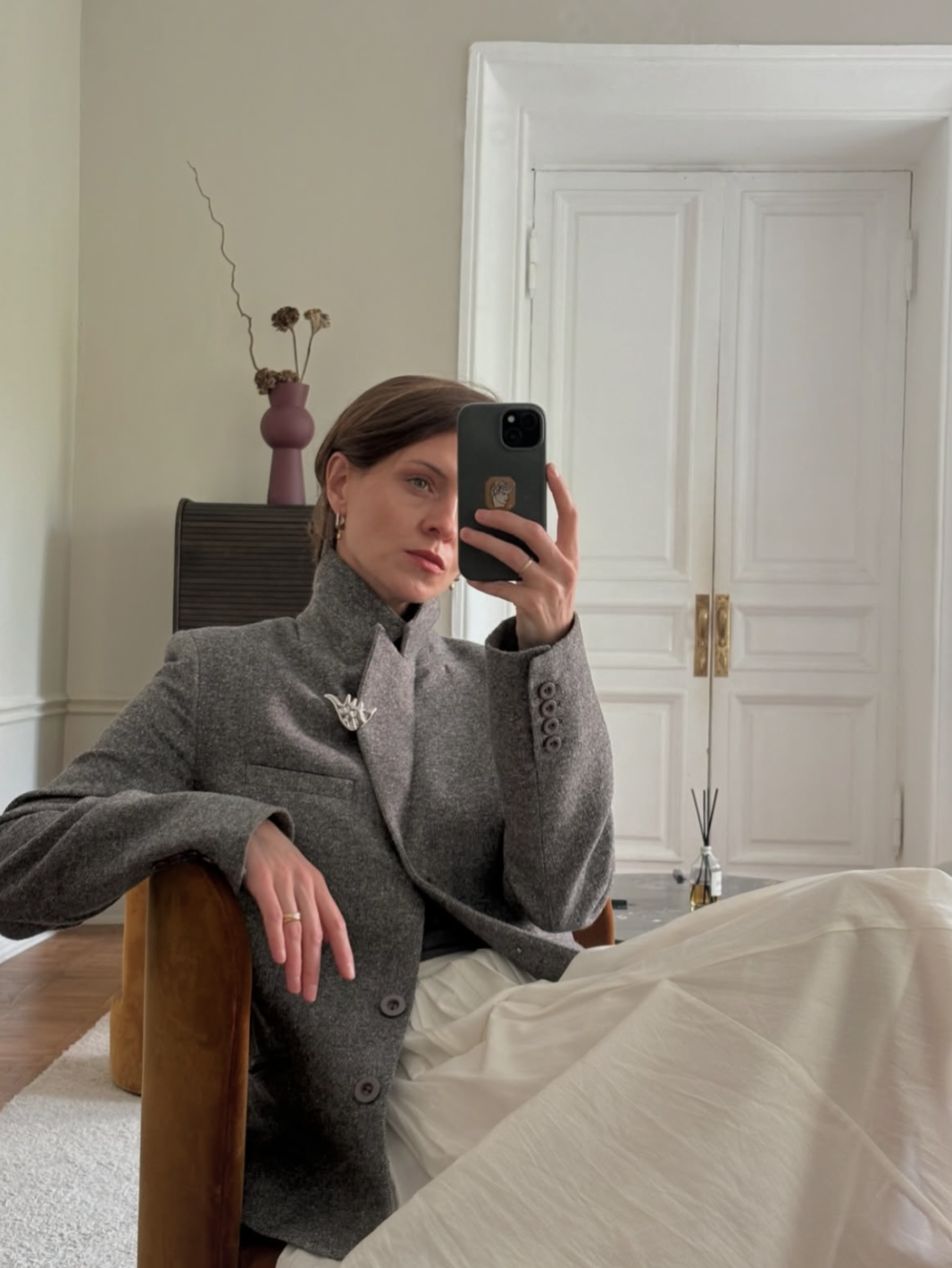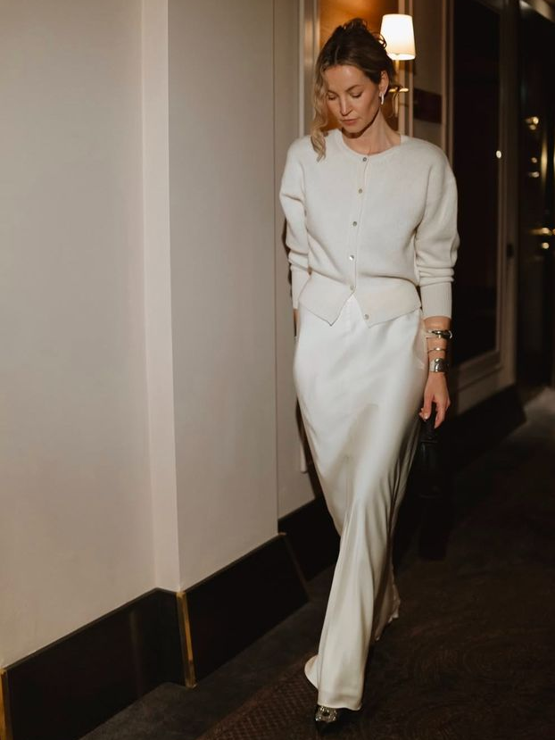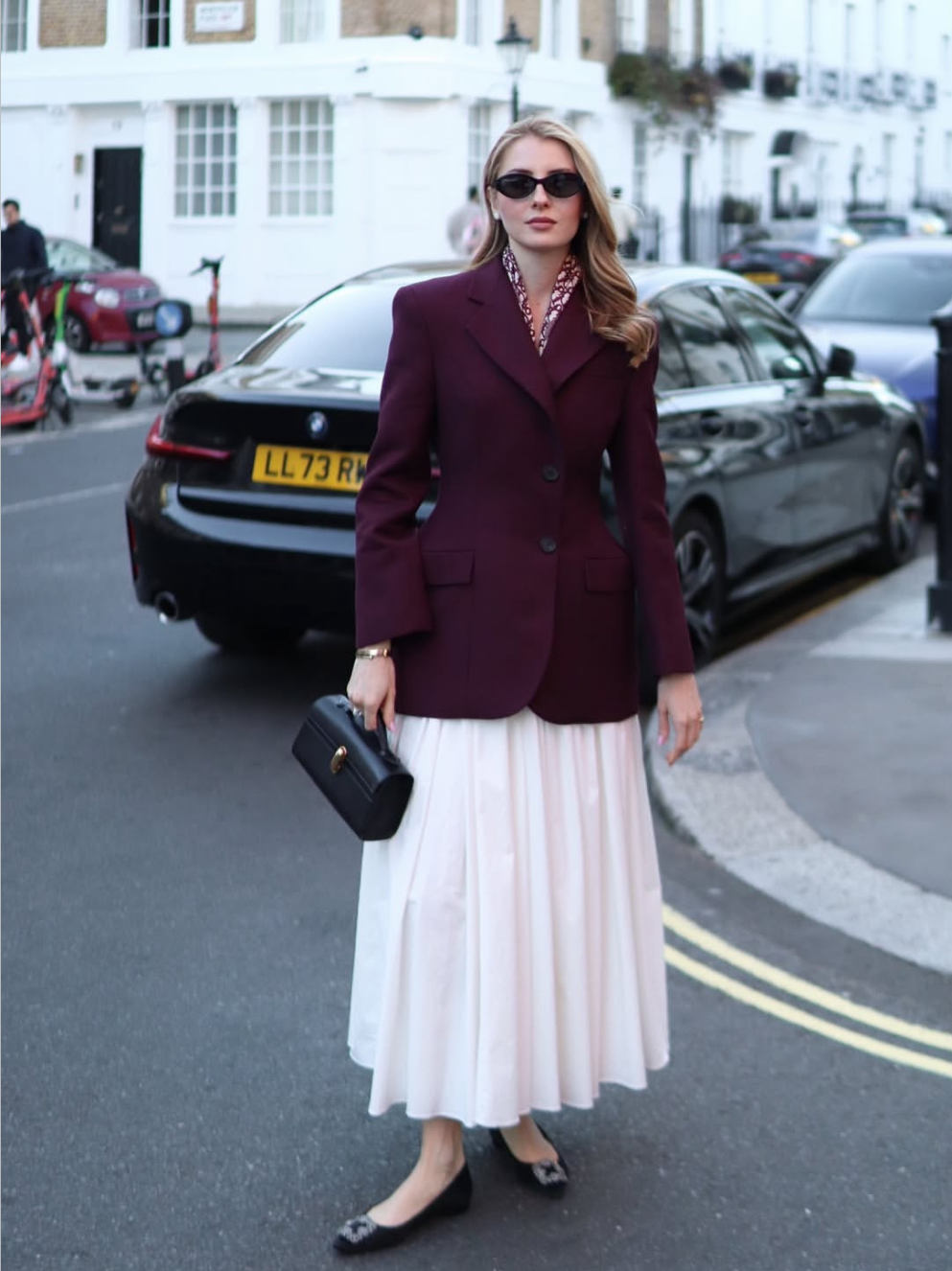 想为西装添一分柔和,A字裙是恰好的选择。当面料从腰际悄然散开,不张扬、不蓬松,只是用一道简洁的弧度中和西装的硬朗。