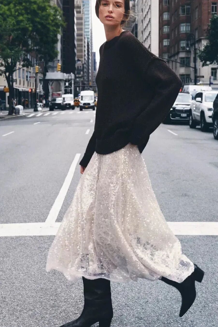 当蓬松羽绒包裹肩颈,裙摆却在寒风中画出轻盈弧线,这恰是冬日最精妙的着装博弈。厚重面料并非压制,而是以沉默姿态托举出裙装的流动美学。