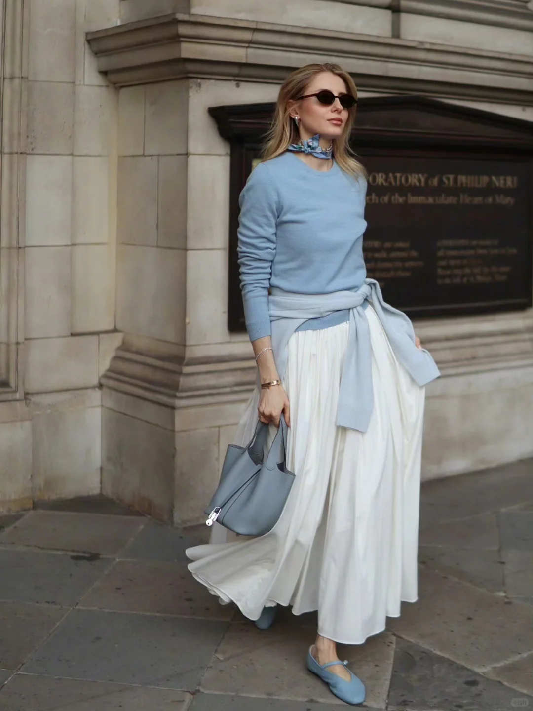 初恋裙极少有紧绷的剪裁,大多是 A 字裙、直筒裙或是轻微收腰的伞裙款式,长度恰好停在膝下或小腿中段,既不会过于暴露而显得轻浮,也不会过于曳地而显得拖沓。