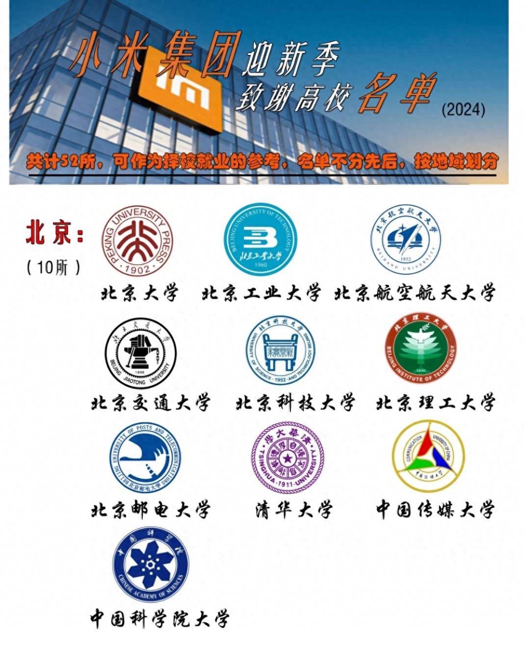 北京作为小米的总部所在地,入选的10所院校几乎覆盖了国内顶尖的理工与综合类高校,是小米校招的“第一阵地”。