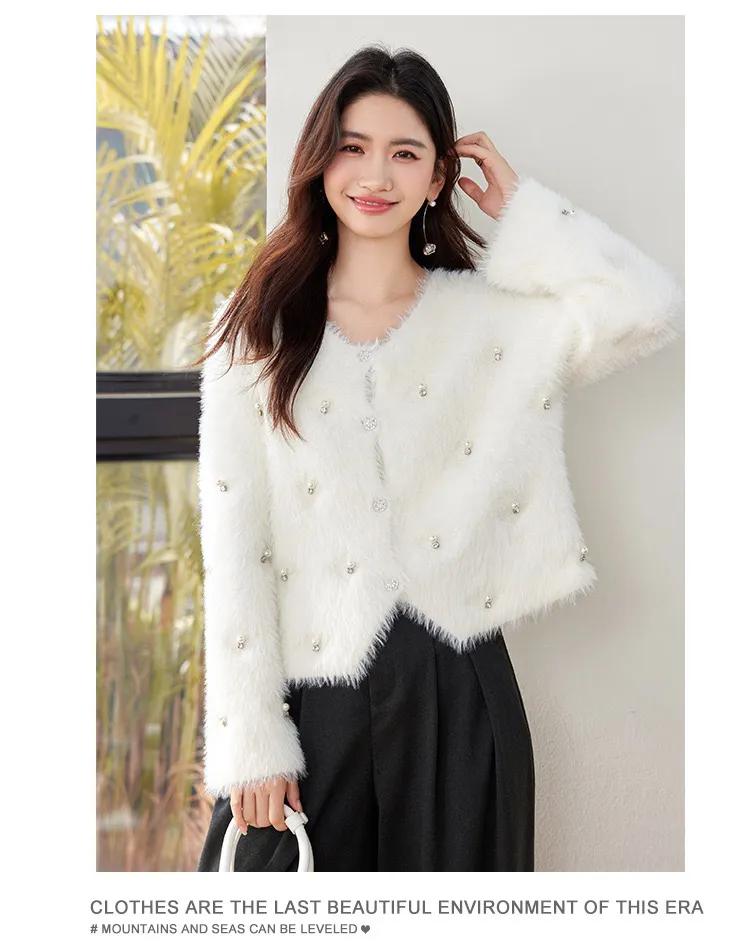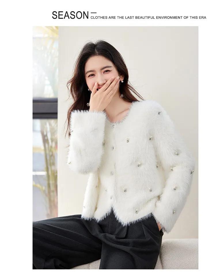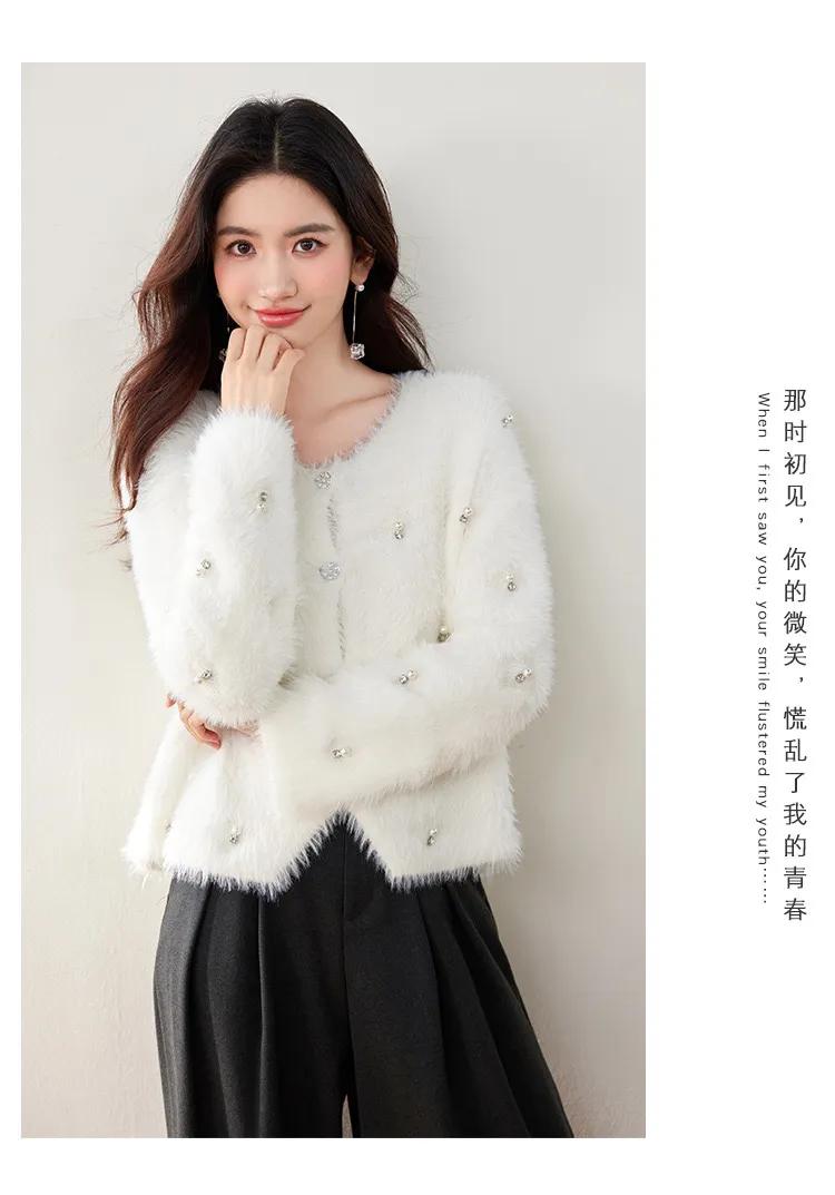 当你将它穿在身上,就像被一层暖阳温柔包裹,寒冷与疲惫瞬间消散。精致的钉钻设计,是这件开衫的点睛之笔。在领口、袖口或是门襟处,闪烁的钻饰如繁星点点,与软糯的毛绒相互映衬。