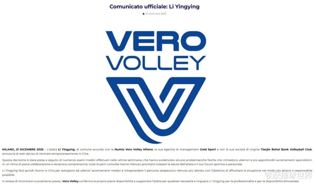 北京时间12月21日,关于中国女排主力李盈莹的留洋之路终于尘埃落定,意大利米兰女排官方发布公告:“检查结果显示李盈莹存在一些身体状况问题,需进一步进行更深入、专业的医学评估,在完全互信与理解的氛围下,相关各方一致认为,保护运动员的健康以及其未来的职业与个人发展应当被优先考虑,因此,李盈莹将返回中国,俱乐部期待与李盈莹再次见面,感谢她所展现出的专业态度与积极配合。”