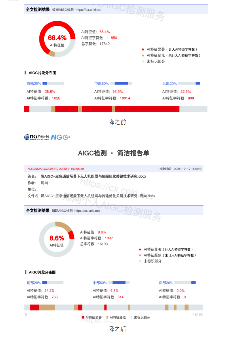 一个师妹的论文初始AI率66%、查重率39%,上传后5分钟处理完,再测AI率8%、查重率 7%,完全达标。据悉某学院32 篇论文用它优化后,平均 AI 率才 14.3%,11 篇低于 10%,全过盲审。
