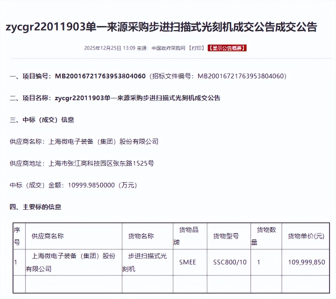 12月25日,中国政务采购网显示,科技部以1.1亿元采购上海微电子SSC800/10光刻机,用于万通道级神经电极制造。该设备分辨率≤110nm,套刻精度≤15nm,虽非尖端芯片级,但适配脑机接口、生物芯片等细分场景,打破进口依赖。