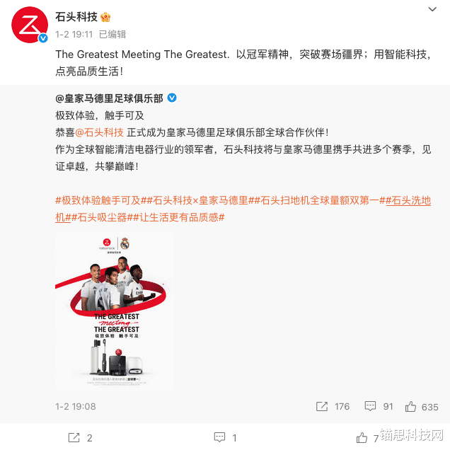1月4日消息,智能清洁电器领域龙头企业石头科技正式宣布,与全球顶级足球俱乐部皇家马德里达成全球战略合作,双方将携手亮相于