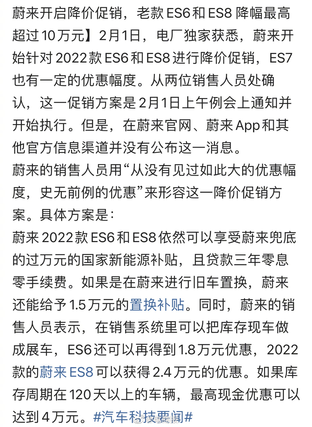 蔚来开启降价促销,降幅最高超过 10 万元?工作人员回应:针对少量展车、库存车给予优惠政策。新能源汽车价格开卷了。