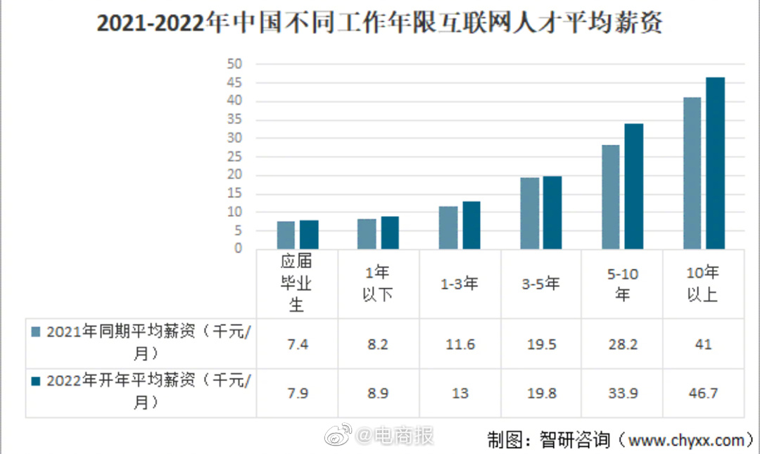 2022年中国互联网行业平均月收入18500元,较去年增长7.5%,增幅为0.6%。工作年限1-3年人才可达月收入超1万水平。(图源:智研咨询)