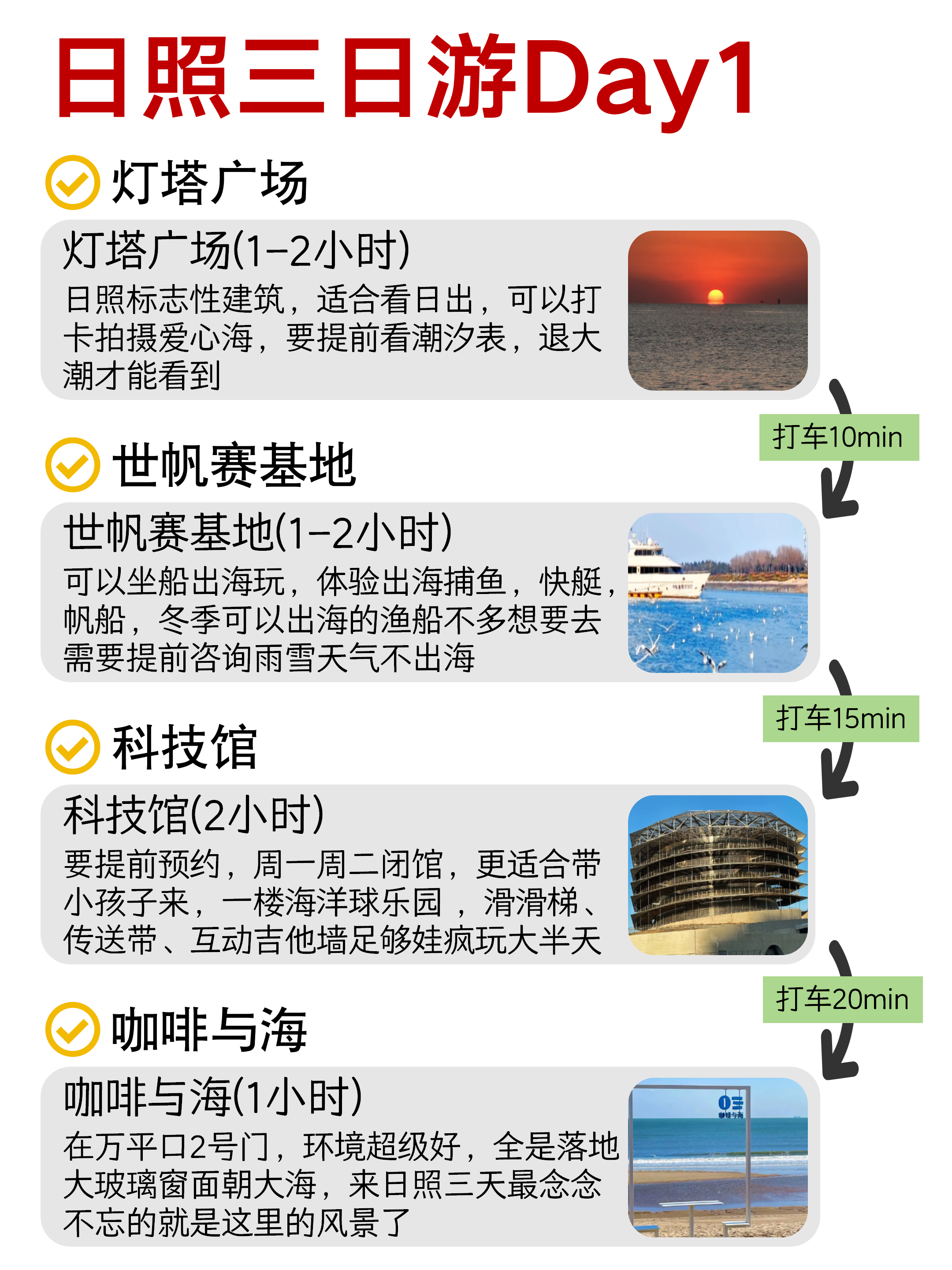 🌟第一天早上可以去灯塔广场看日出,接着去世帆赛基地(需要提前约好出海的船只)科技馆可去可不去,带小孩子👶的可以去!