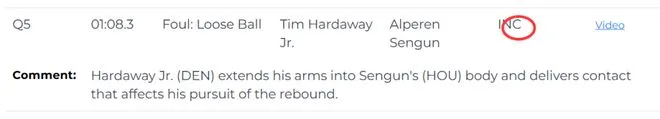 尽管掘金队当晚的总犯规数(28次)多于火箭队(25次),但联盟出具的该场比赛最后两分钟裁判报告显示,在加时赛最后两分钟内出现的三次错判,最终均对掘金队有利。