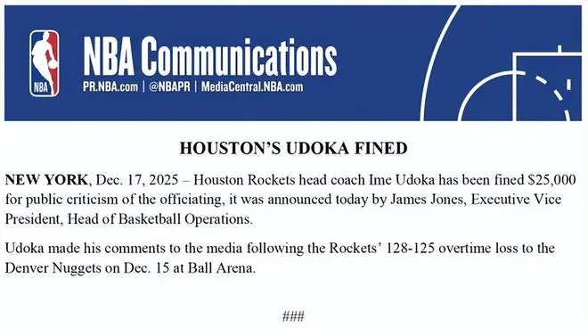 北京时间12月18日,NBA官方公布罚单,休斯顿火箭队主教练乌度卡因在周二球队加时惜败丹佛掘金队后公开抨击裁判判罚,被联