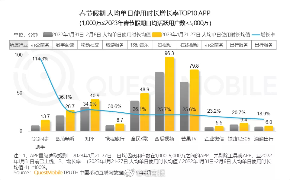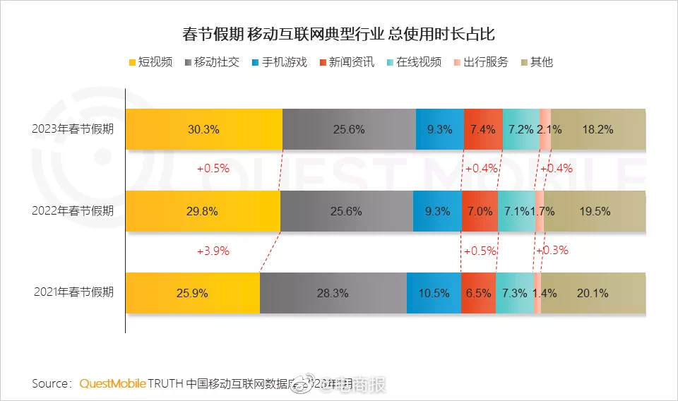 春节爱奇艺、抖音极速版、西瓜视频、芒果TV等用户使用时长大幅增长,大部分人在追剧、刷短视频(图源: QuestMobile)