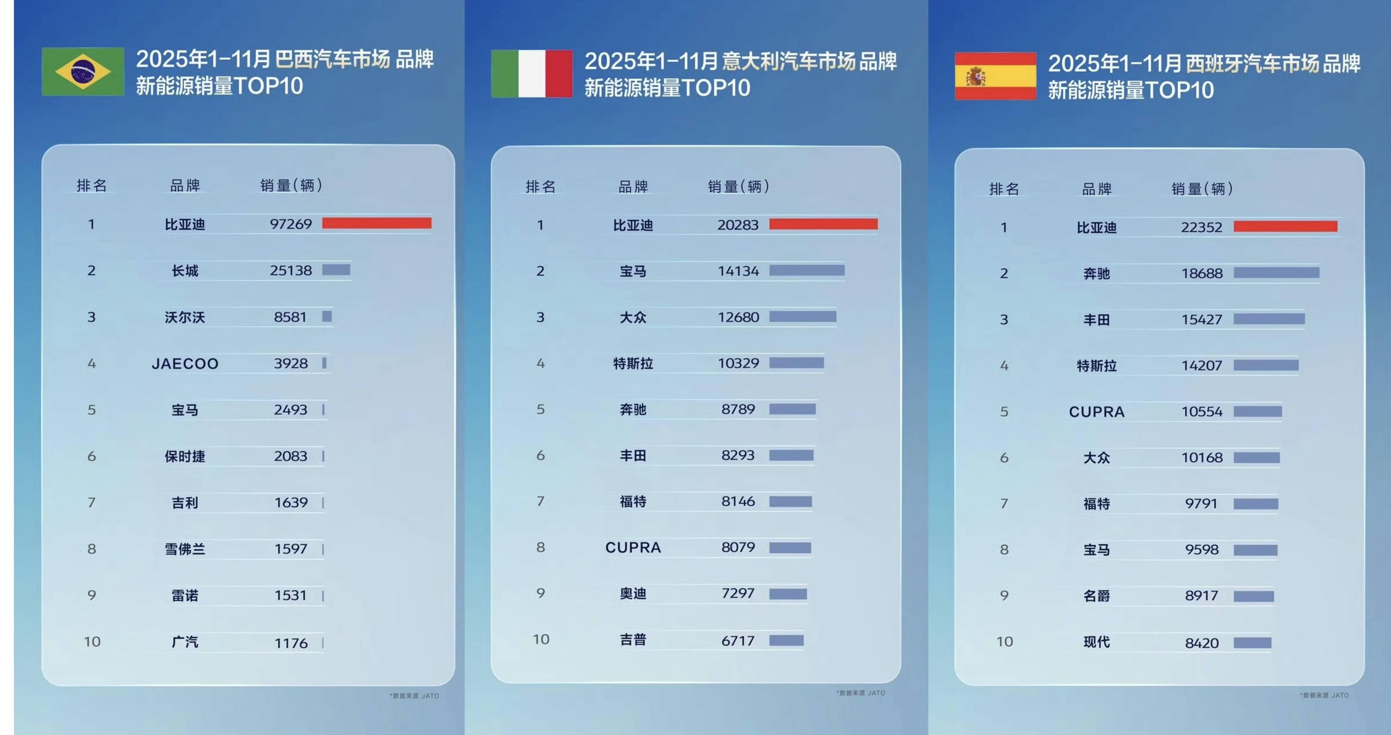 更厉害的是,比亚迪多国销冠全面超越,在巴西、土耳其、意大利和西班牙都稳坐头牌交椅,在新加坡更是全品牌销冠。就算放眼英国、德国、意大利等全球11个核心市场,比亚迪的销量都已经超过了特斯拉。