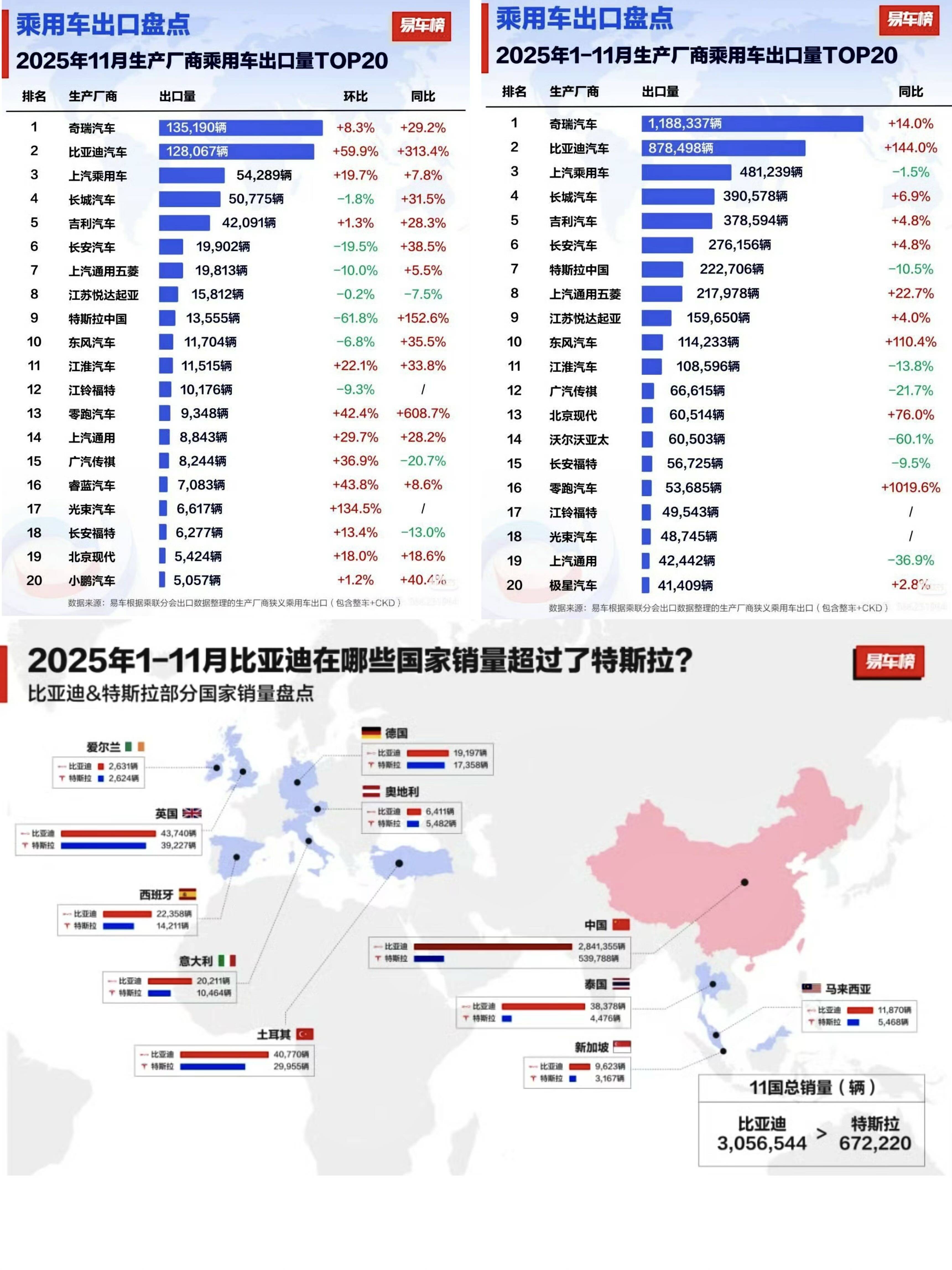 刚才看到一组数据,单今年11月比亚迪就出口了12.8万辆,比去年同期足足涨了3倍多!2025年前11个月,累计出口已突破87.8万台,相当于去年全年的两倍,这发展速度真的没谁了。