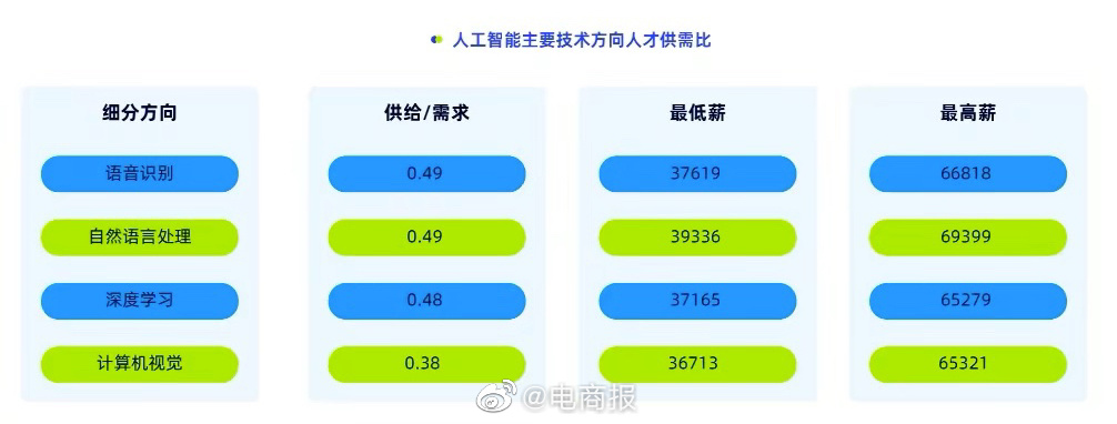 互联网企业人工智能人才储备量排名,华为、百度、字节跳动、腾讯分列各细分领域第一。技能型人才中,计算机视觉供需比最低,人才最为紧缺。(图源:脉脉人才智库)