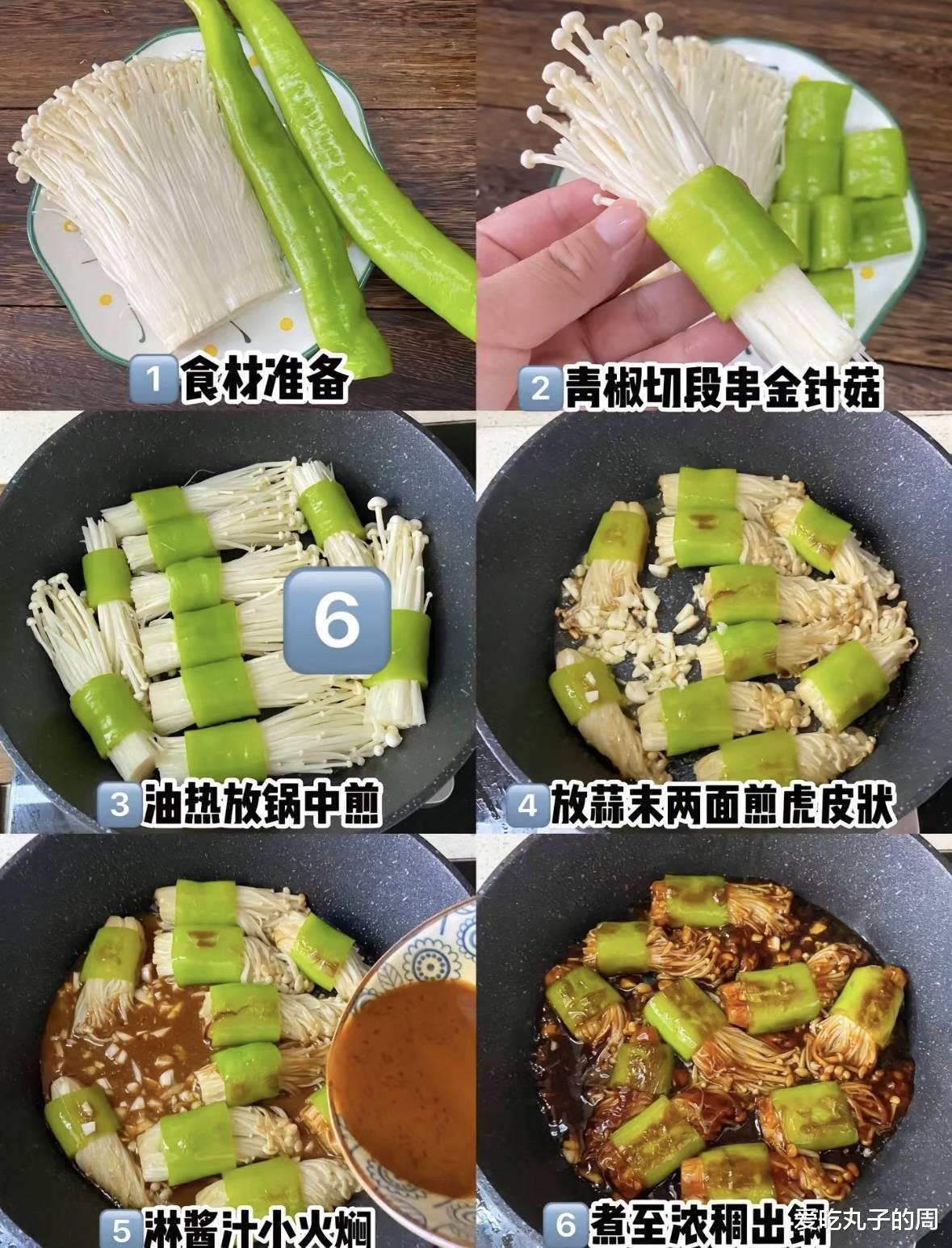 步骤:准备材料:将青椒洗净,去蒂去籽,切成适合卷入金针菇的长度;金针菇去掉根部,洗净备用。处理青椒:如果青椒比较大,可以在热水中稍微焯一下,使其变软一些,这样更容易包裹金针菇。注意不要煮得太久,以免失去脆度。卷制:取适量的金针菇放入青椒中,然后将青椒卷起来,用牙签固定两端,防止烹饪过程中散开。预热锅具:在平底锅或炒锅中加热适量植物油。爆香配料:如果使用大蒜,可以先将切碎的大蒜放入热油中爆香。煎制青椒卷:将青椒卷放入锅中,中小火慢煎至表面略微焦黄,这样可以使青椒更加香脆。