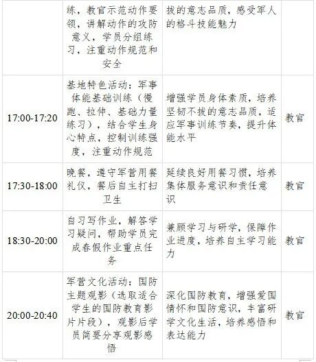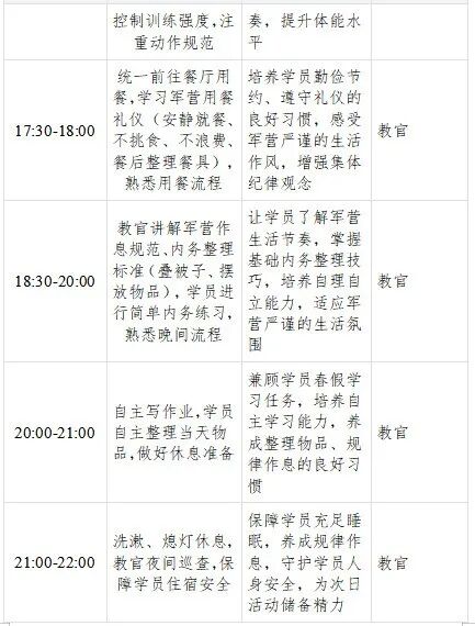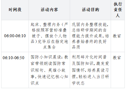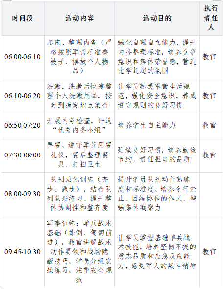 2.餐饮与住宿保障:提供军营标准餐,营养均衡、荤素搭配,符合青少年生长需求,严格执行用餐礼仪与卫生标准;住宿为基地标准营房,4—6人/间,空调、独立卫浴齐全,实行封闭式管理。