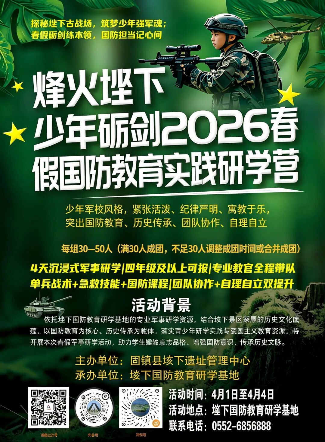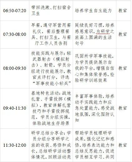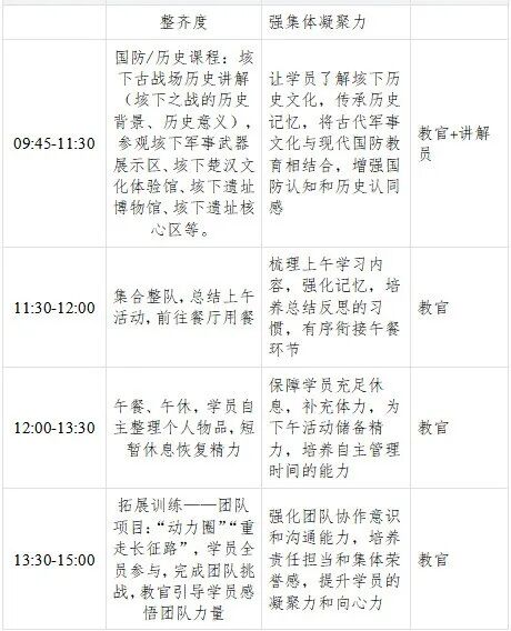 1.场地与物资保障:在垓下国防教育研学基地,提前排查调试训练、住宿、餐饮、教学场地及设施;统一配发军营作训服(1.6米以下建议带校服)、研学手册等物资,军事器材、急救用品由专人统一管理,规范存放与使用。