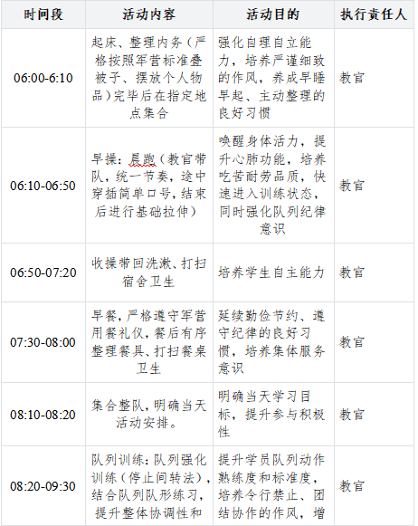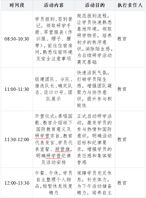 4.组织与服务保障:明确各环节责任人与执行标准,统筹学员接送、饮食安排、训练指导、学习辅导等工作;每日复盘优化,及时解决活动中的各类问题,兼顾研学与学习,确保活动圆满落地。