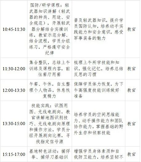 3.师资与安全保障:配备专业教官、讲解员、医药保障人员,全程驻场服务;建立安全管理机制,24小时值守巡查,开展安全培训,配备急救物资,与就近医院建立应急联动,制定各类应急预案。