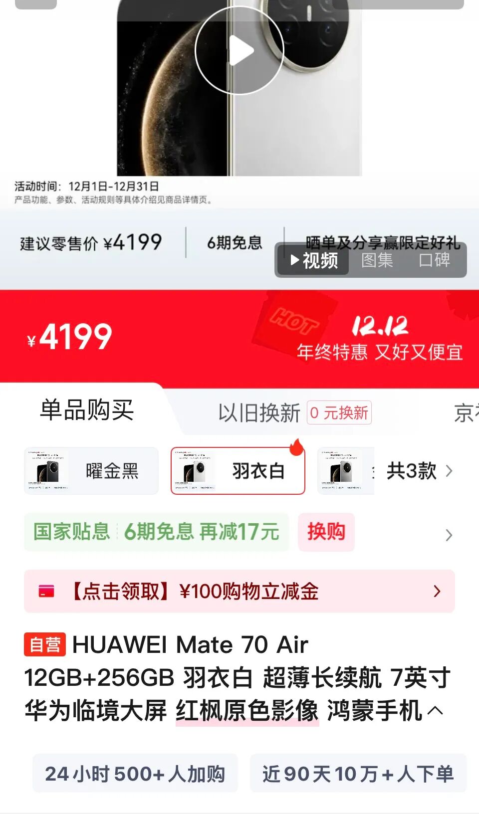 例如11月初发布的华为Mate 70 Air,名为Air,但厚度有6.6毫米,重208克,且搭载了一块6500毫安时的电池,售价4199元起。单就华为京东自营旗舰店的销售情况而言,这款性能、价位相对平衡的Air机型得到了不少人的青睐。