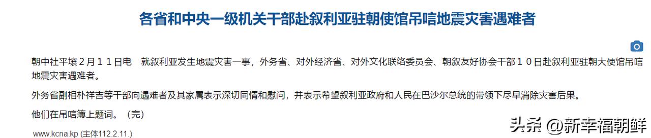 朝鲜机关干部赴叙利亚驻朝使馆吊唁地震灾害遇难者。 2月11日 就叙利亚发生地震灾害一事,朝鲜外务省、对外经济省、对外文化联络委员会、朝叙友好协会干部10日赴叙利亚驻朝大使馆吊唁地震灾害遇难者。 外务省副相朴祥吉等干部向遇难者及其家属表示深切同情和慰问,并表示希望叙利亚政府和人民在巴沙尔总统的带领下尽早消除灾害后果。 他们在吊唁簿上题词。
