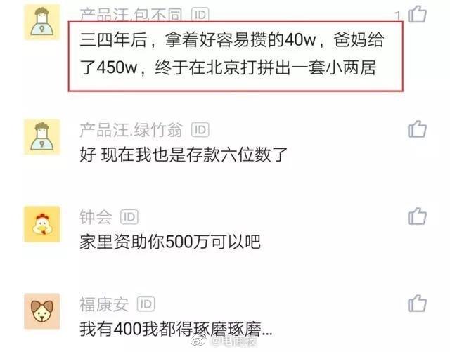 同学在的国企,新来一看就是带着乡土气息的眼镜儿男孩,同学觉得刚来这边生活应不容易,就作为老同志跟人家聊天谈心,男孩儿很腼腆的告诉他,家里刚给他在北五环奥体附近买了套房,,,
