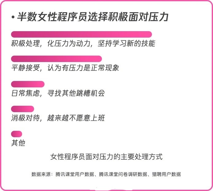 女程序员职场最大压力,主要源于互联网行业迭代快、工作强度大、晋升空间低。女性面试时反复被问到的婚育、家庭问题,在其压力来源中排第四。(图源:猎聘)