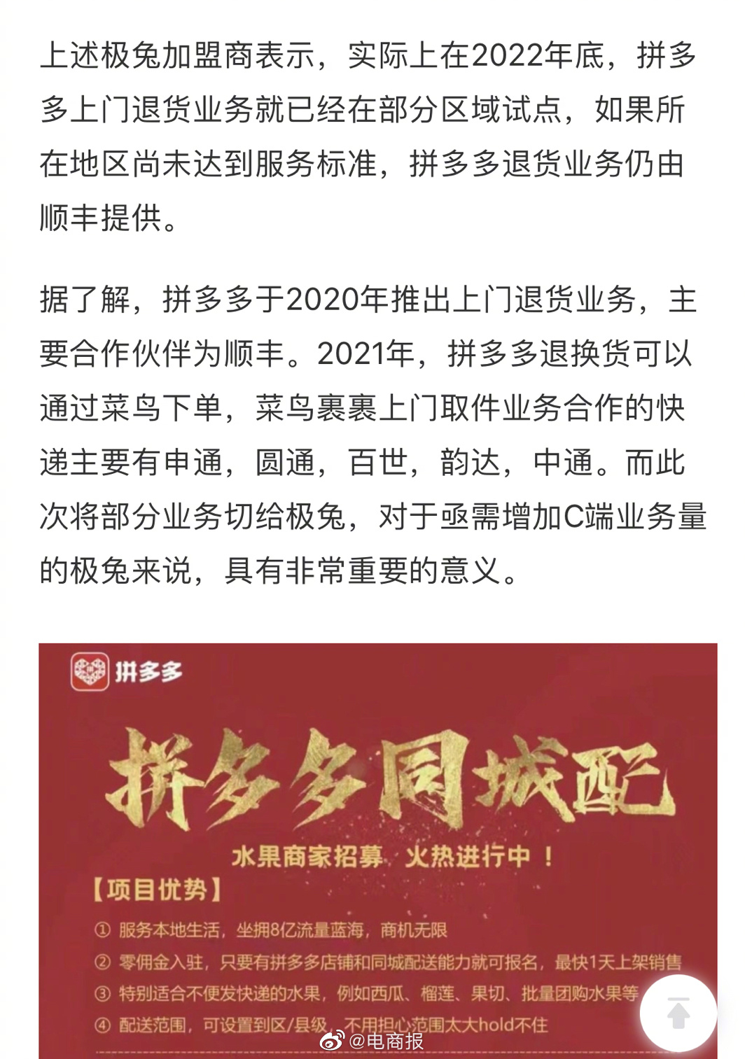极兔承接拼多多上门退货业务,在多个城市开始试点。大家有用过的吗?